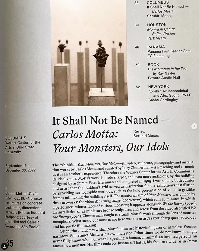 Review Art Papers by Serubiri Moses, Spring 2023 More info here Screening Mourning Stage at Oberhausen Film Festival, April 29, 2023 More info here Solo Show Carlos Motta at PPOW Gallery, September 8- October 7, 2023 More info here Survey Show Stigmata at MAMBO, March 16- June 11, 2023 More info here Group Exhibition Macho: Representing Masculinity, Another Space, NY More info here Screening Bogoshorts More info here Artist Talk Critical Dialogues, Tyler School of Art, Nov 2, 2022 More info here Group Exhibition 58 Carnegie International More info here Solo Exhibition Wexner Center for the Arts, Columbus, Ohio More info here Group Exhibition Skin in the Game, Chicago more here Older Posts Newer Posts