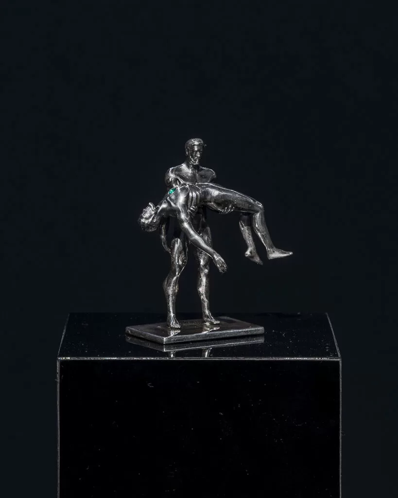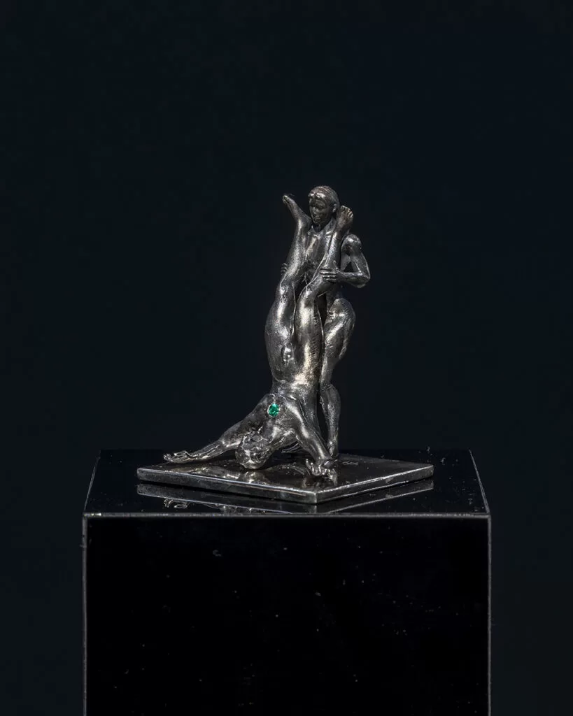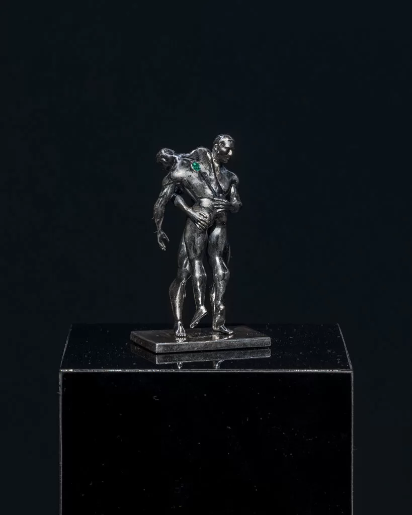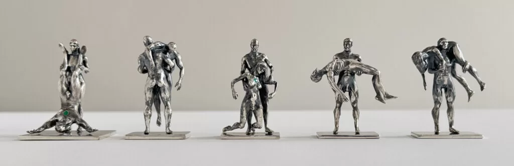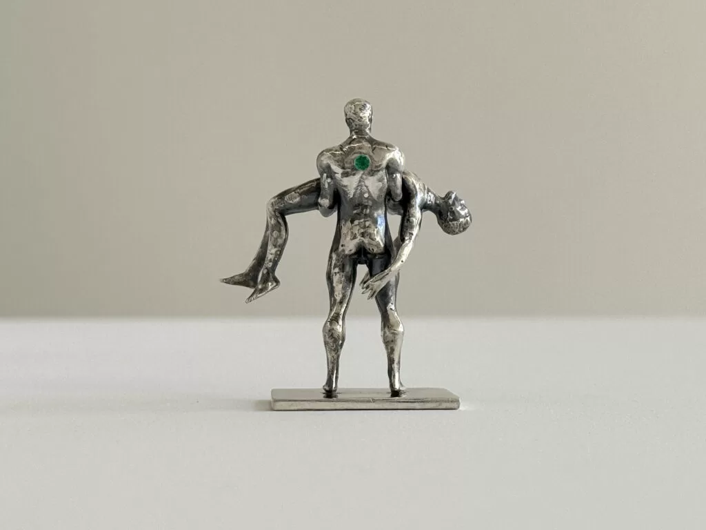 Each sculpture in When Falling Feels Like Flying, just five centimeters tall and cast in silver with emerald inserts—speaking to Colombia’s violent history of extraction—consists of a pair of figures. One person stands while holding the full weight of the second: draped across the erect figure’s shoulders, hanging by arms or legs, or carried in front like an offering or pietà. It is a burden never abandoned, transformed into an eternal embrace.
