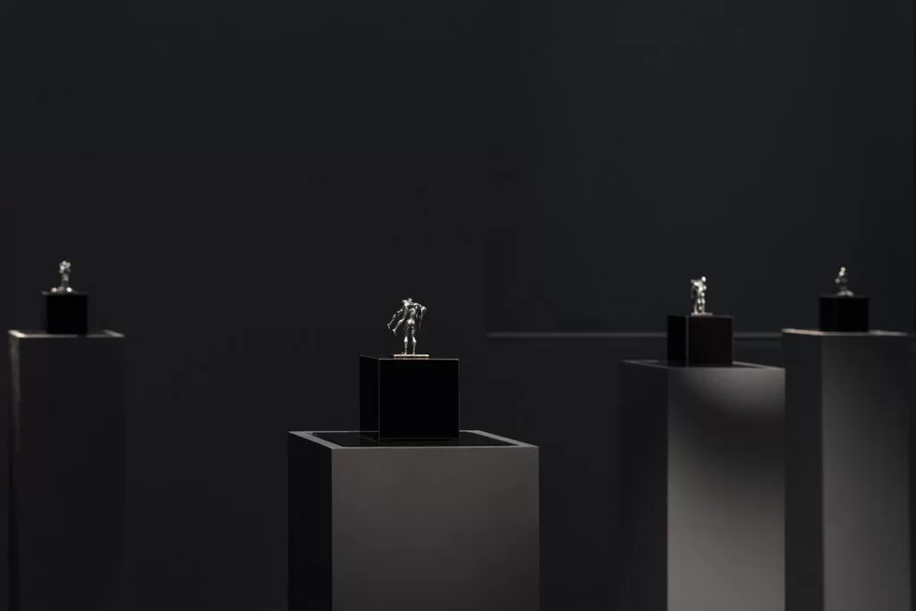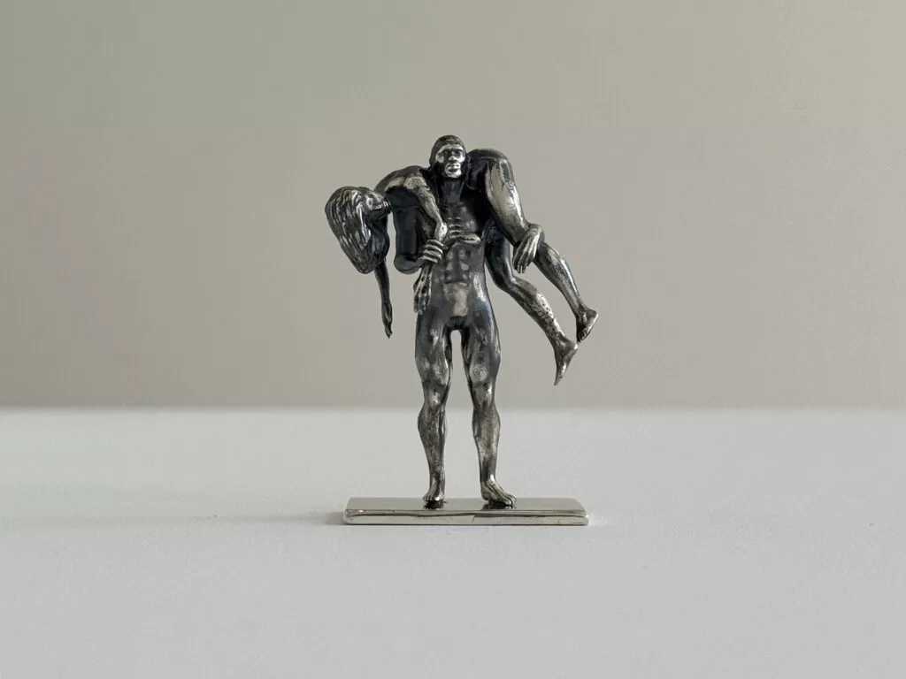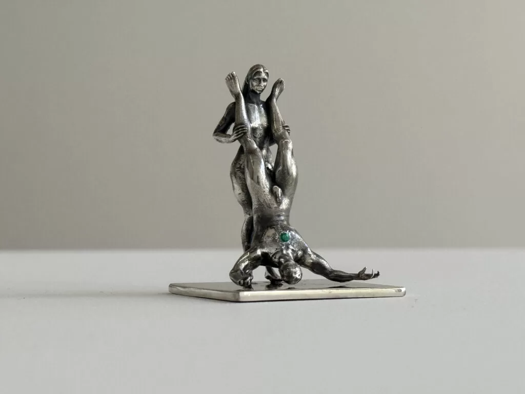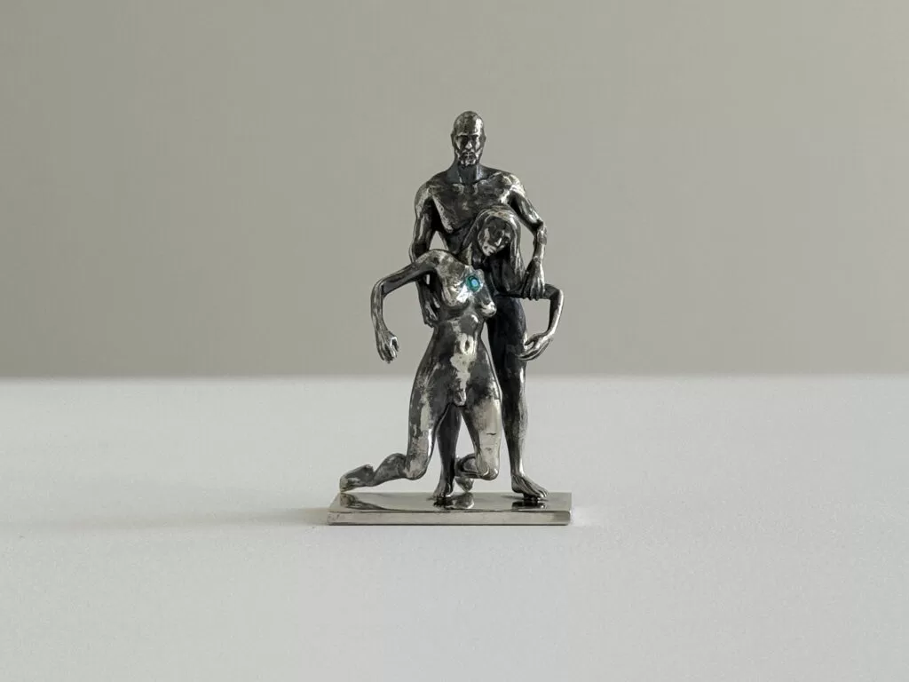 Each sculpture in When Falling Feels Like Flying, just five centimeters tall and cast in silver with emerald inserts—speaking to Colombia’s violent history of extraction—consists of a pair of figures. One person stands while holding the full weight of the second: draped across the erect figure’s shoulders, hanging by arms or legs, or carried in front like an offering or pietà. It is a burden never abandoned, transformed into an eternal embrace.