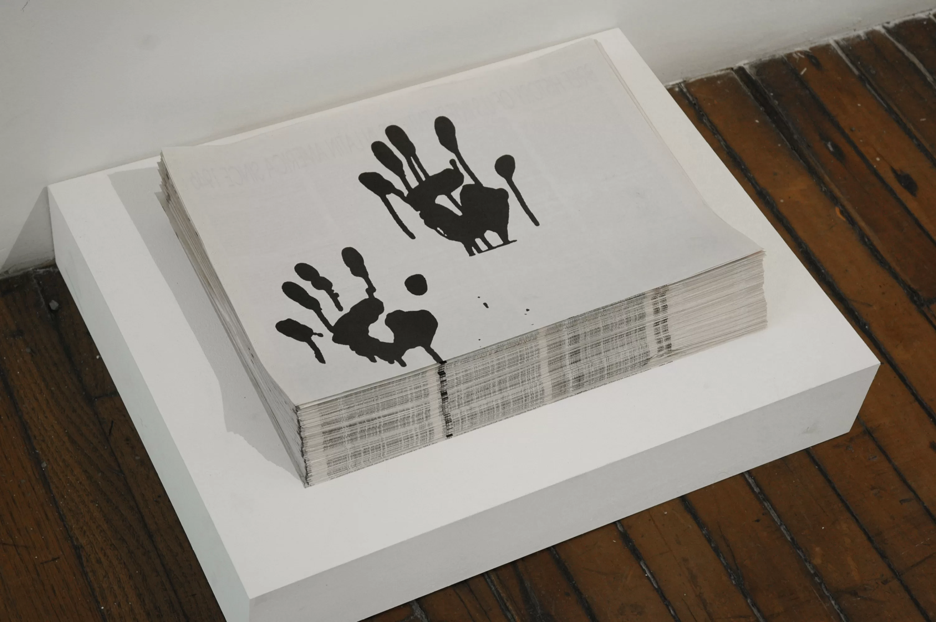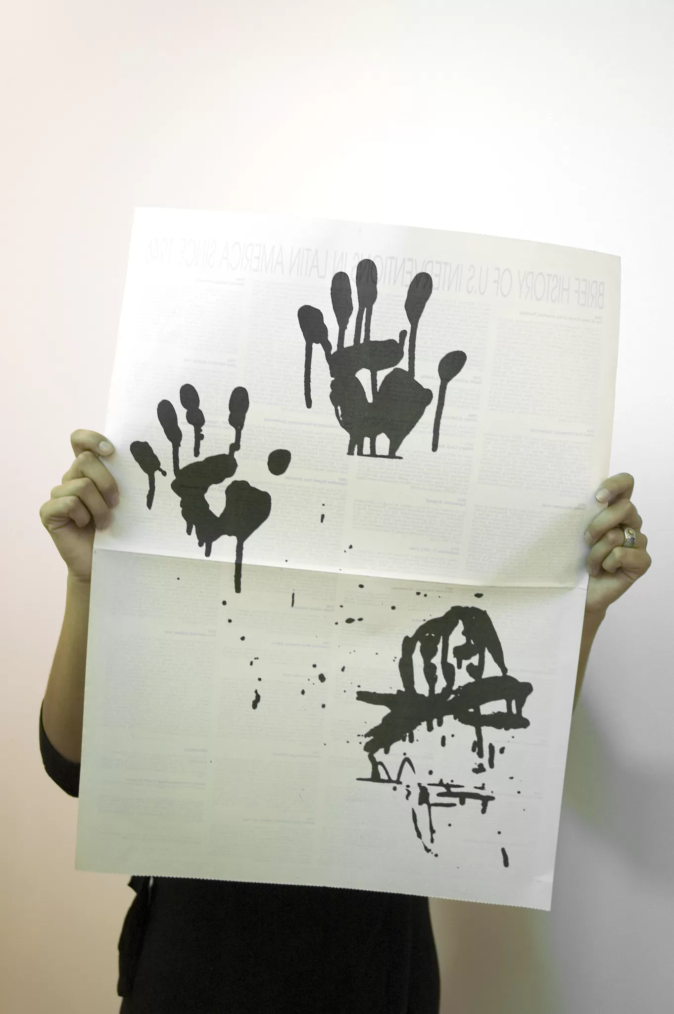The large black image in the lobby titled SOA: Black and White Pain-ting # 15 (2005-09) was appropriated from a Colombian newspaper and depicts a group of soldiers advancing with guns drawn. This abstracted and de-contextualized image confronts the viewer with a war scene but does not reveal who is fighting against whom. The newspapers, which are free for visitors to take, respectively present a brief history of U.S. interventions in Latin America and a history of leftist guerrillas in the same region, both spanning the years of the Cold War. Brief History engages a history of "enemy" ideologies.