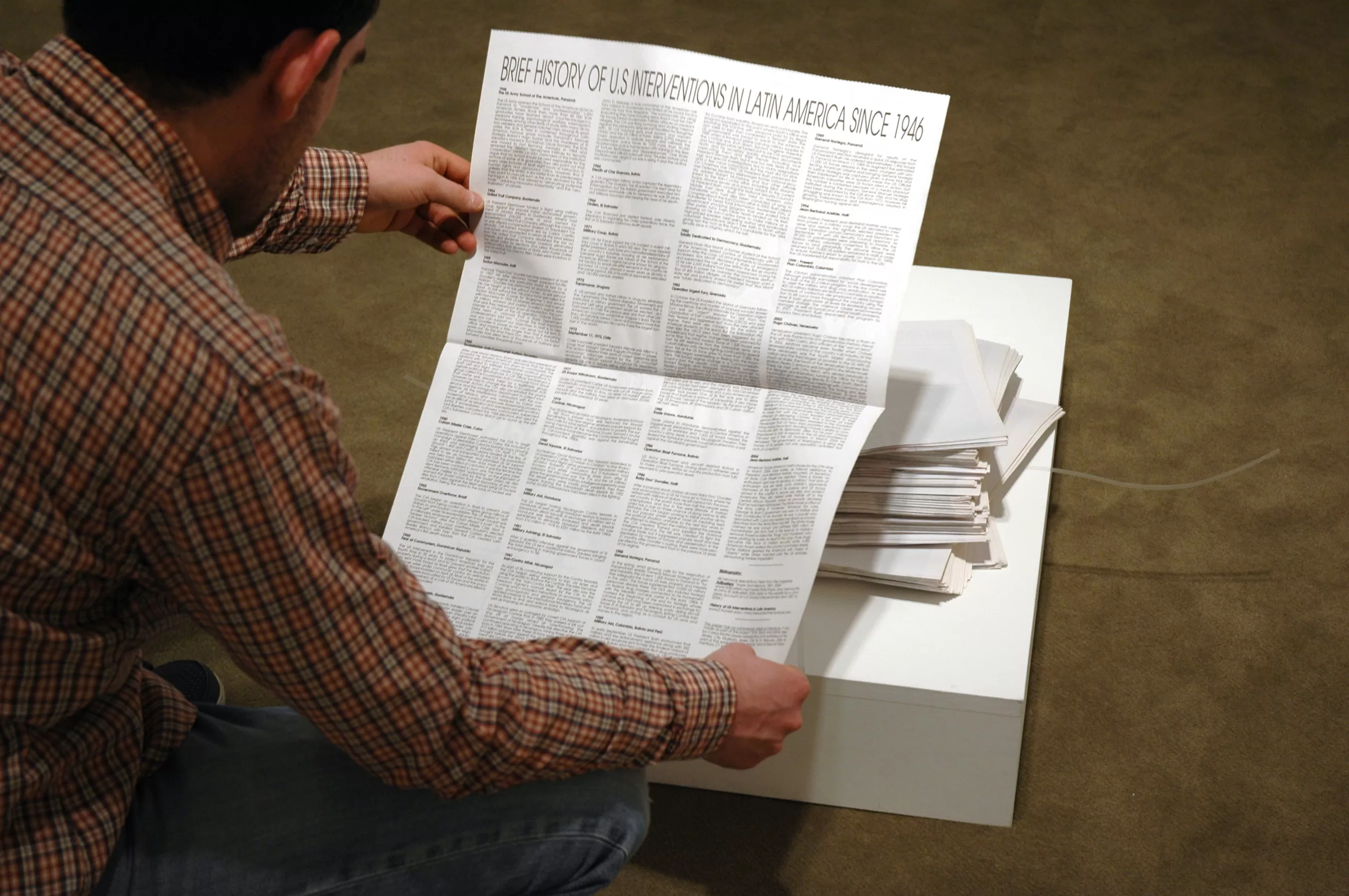 Brief History, (2005-2009), the first solo project in a New York museum by Colombian-born, New York-based artist Carlos Motta, consists of a black vinyl mural and an edition of two newspapers. This installation is part of the SOA Cycle (2005-2009) a project through which the artist examines the School of the Americas (SOA)-a Cold War institution sponsored by the U.S. government to train Latin American soldiers in counterinsurgency tactics and military strategy, originally established with the aim to prevent the spread of communism in Latin America.