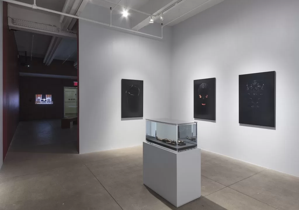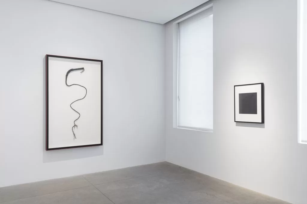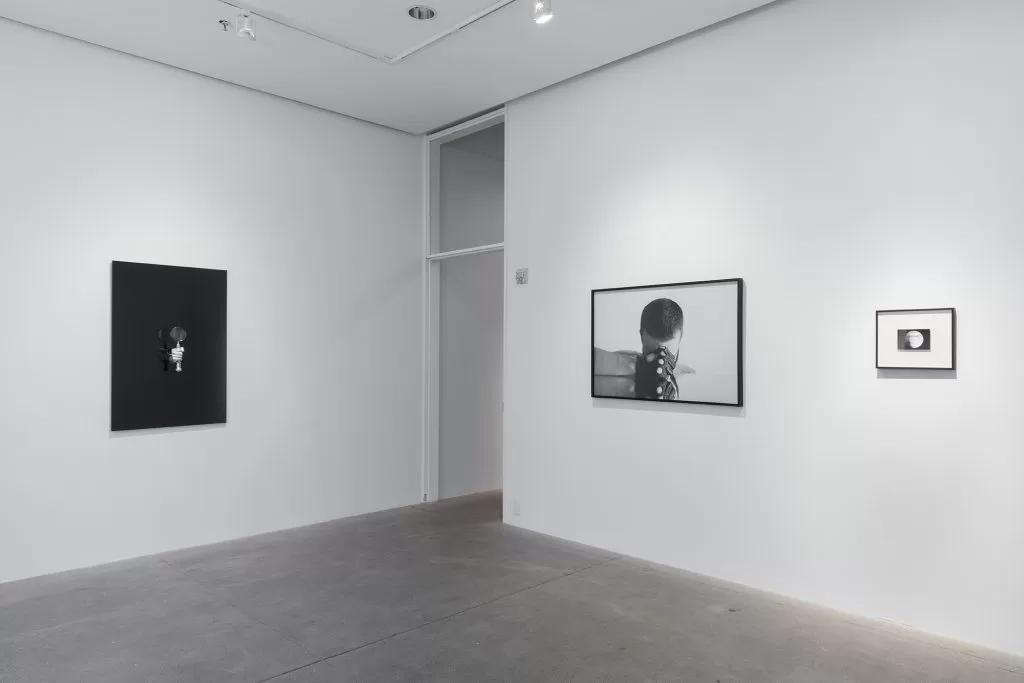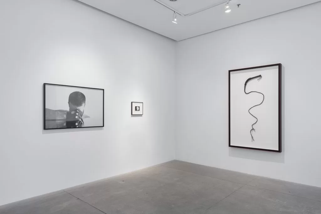 The works in this room reflect on the complex heritage of art and sexuality that occasioned the authorial identity of Motta himself. In Self-Portrait with Whip, for example, the artist restages Robert Mapplethorpe’s once-scandalous photograph of the same title (1978). To summon this memory from the gay art canon is to reassess its cultural legacy. Reflected in a glass darkly, the viewer does not escape capture within the art historical confrontation. It is an invitation to reexamine received histories in light of present conditions. Across the room, a framed whip entitled Corpo Fechado is positioned handle up, in a distinctly serpentine posture. It might appear like fetish gear, but it is also the very prop from Corpo Fechado: The Devil’s Work that signaled historical atrocity. Its frame is a direct citation of David Wojnarowicz, who used the same black-and-red design for his Sex Series (1989). The colors themselves refer to BDSM culture; red is hanky code for fisting. As if on cue, Motta’s fist thrusts out from a nearby work, The Symptom, bearing an ornate magnifying glass. From a mathematically precise focal length, the lens enlarges an alchemical eyeball ring embedded in the monochrome surface. Both lens and ring are more baroque citations, and the mingling of math and mysticism suggests that, just as in previous eras, the certainties of today become the myths of tomorrow. Historical humility is called for. Art and sex, like history, involve mistakes. Mistakes, again like history, can be traumatic to bear, and redemption is neither cheap nor easy. The difficulty is clear enough in the Untitled Self-Portrait that rounds out this room. Motta’s image is twinned in a reflective surface, even as he buries his face on another fist, this one in a leather glove. Combining the fist of defiance with a gesture of contrition, the posture is both mournful and resolute. Sometimes to gaze into a mirror is to see the malefactors of history leering back out, and real progress requires the courage to criticize even oneself. Conatus reminds us: the challenge is to persist.