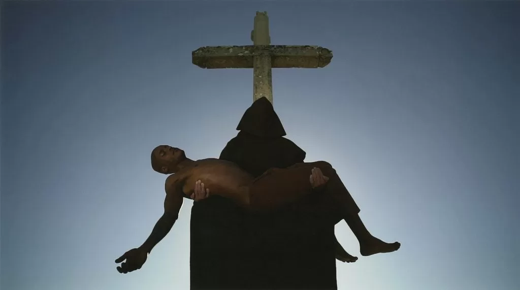 The multilayered video, Corpo Fechado—The Devil’s Work, relates the true story of José Francisco Pereira, an 18th century man who was kidnapped from West Africa and sold into slavery in Brazil. As a means of survival, Pereira, movingly played by Angolan actor Paulo Pascoal, along with others in enslaved communities developed syncretic spiritual practices that mixed African with Christian tradition, in the form of bolsas de mandinga — amulets to protect fellow enslaved persons from injury. In 1731, after Pereira was sold to a slaveholder in Portugal, the Lisbon Inquisition discovered the practice and tried him for sorcery. He was also notably charged with sodomy, since he confessed to copulating with male demons in the course of making the amulets. Pereira was exiled from Lisbon and condemned to end his days enslaved rowing in a galley. Corpo Fechado: The Devil’s Work imagines Pereira as the agent of his own narrative, reclaiming the terms of representation from the account of his own destruction.