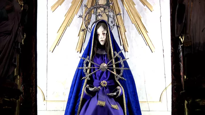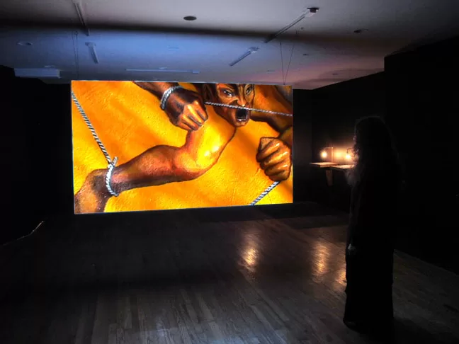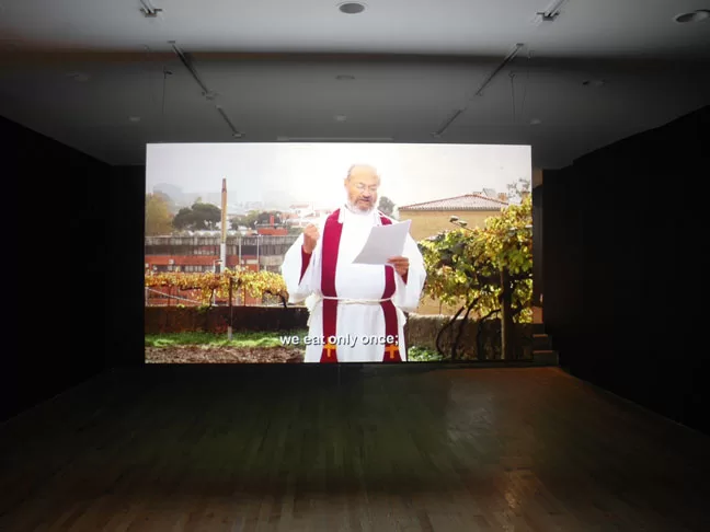The installation presents two set of videos projected onto a two- sided wooden screen: One side of the screen features video documentation of the readings by the priests and the other side of the screen presents images shot in various countries in Latin America: images that show a range of scenes related to religious expressions and indigenous cultures. In the installation, the viewer has to choose on what side of the screen to position herself.