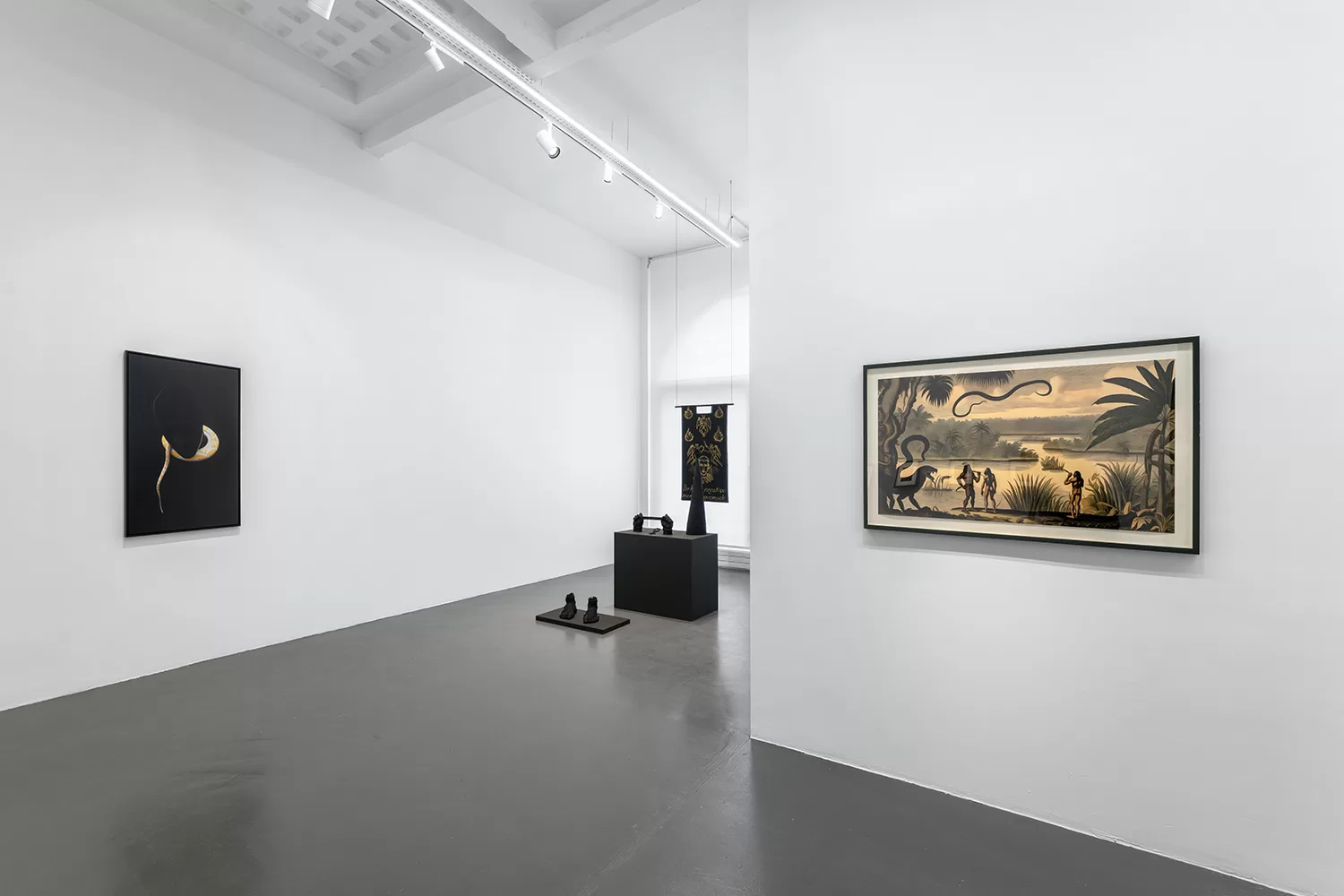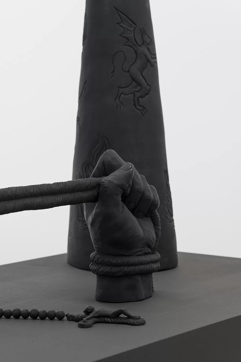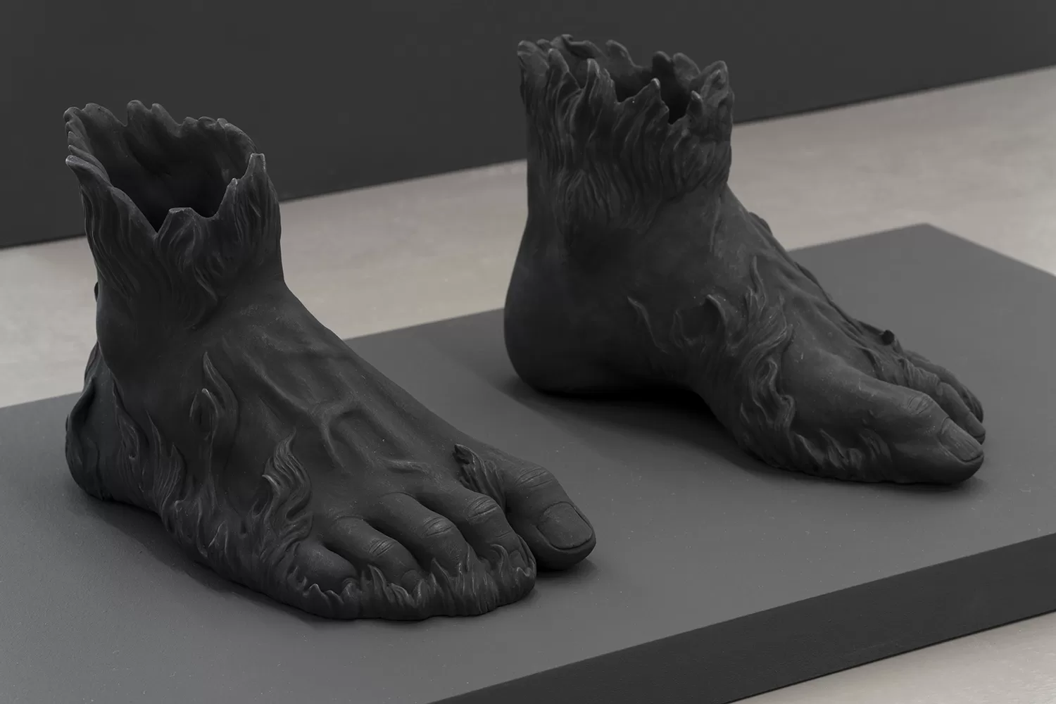 El Auto de Fe (Homme qui va être brûlé par arrest de l'Inquisition), is made from ceramic painted the blackest of blacks, burned alive by the Inquisition for “sins of the flesh.” All that remains are charred pieces: feet engulfed in flames that curl like locks of hair; a peaked cap engraved with demons; a rosary with the devil on a burning crucifix; two hands connected by rope, fists raised as if in a final actof defiance.