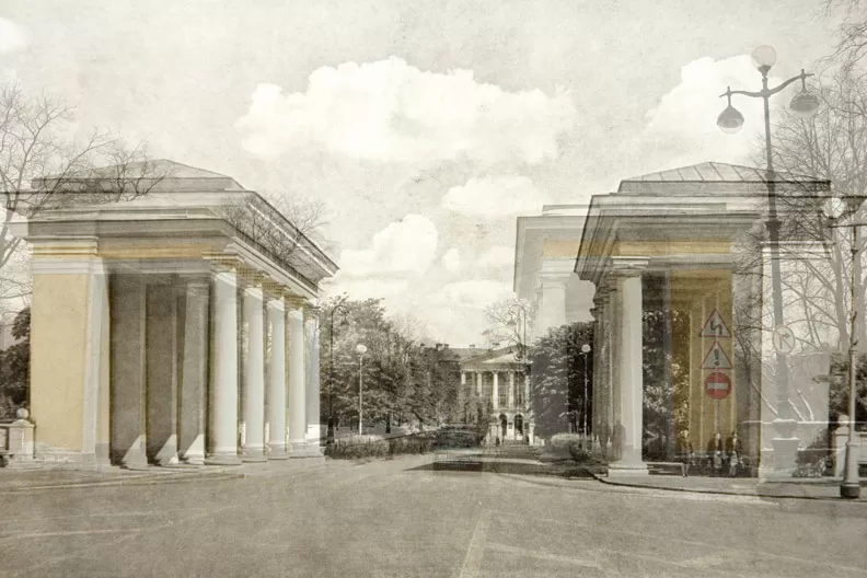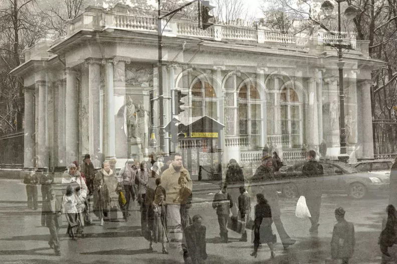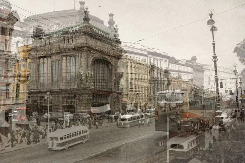 Leningrad, Petrograd, Petersburg (Part 1) is a before-and-after look at landmark cityscapes, based on a 1954 government-published book of photographs of the city. Visiting the city 52 years later, I re-photographed each of these locations, revealing changes to Soviet monuments and architecture. The accompanying voiceover is a recorded conversation between curator Elena Sorokina, artist Yevgeniy Fiks, and myself in which we respond to the images and the many political, historical and cultural aspects that these invoke. Thirty-six of the location pairings are also made as photographic diptychs, which show a wide spectrum of degree of change over time.